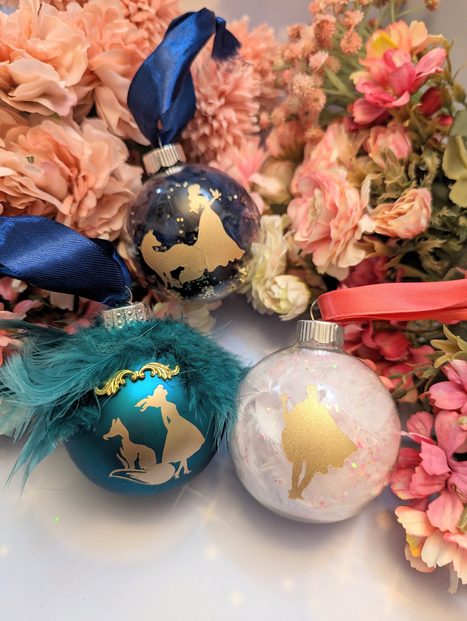 Glass ornaments inspired by Stephanie Garber's Once Upon a Broken Heart and The Ballad of Never After!