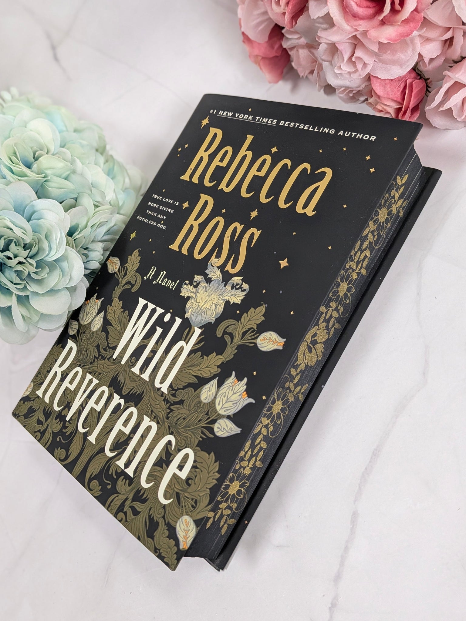 A hardcover edition of Wild Reverence by Rebecca Ross, with stenciled edges, an illustrated hard cover case by @taracphillips, and is SIGNED by the author.